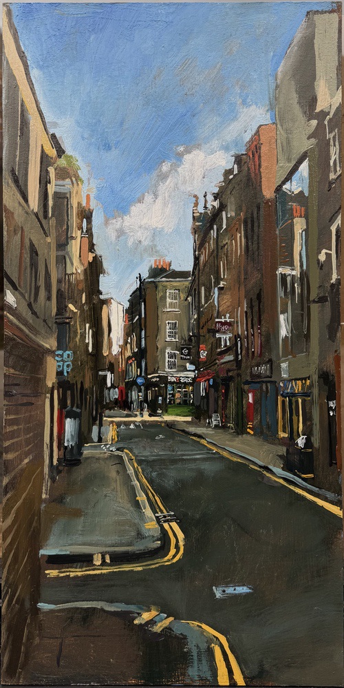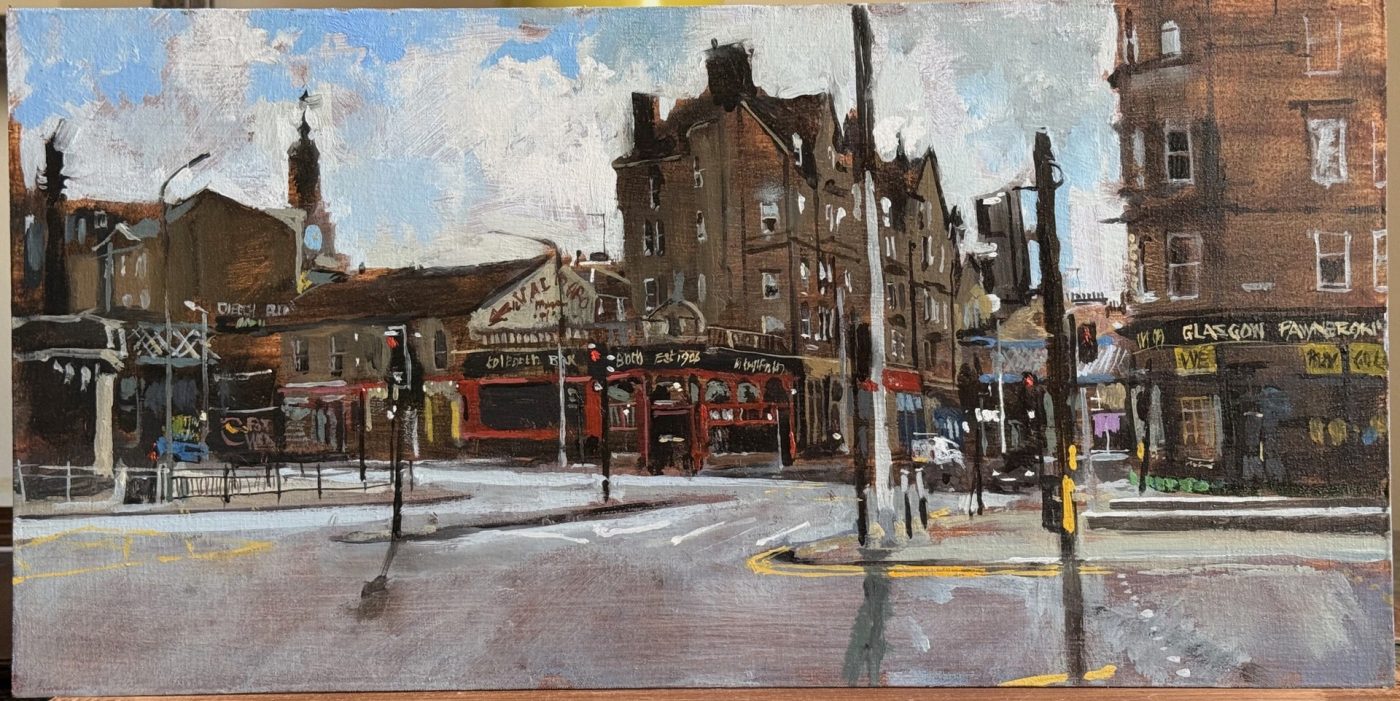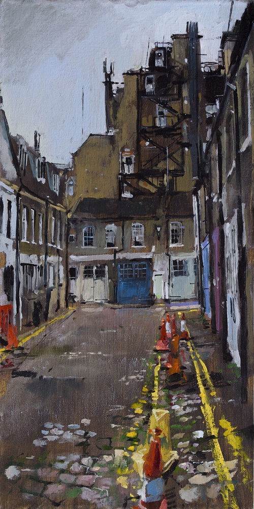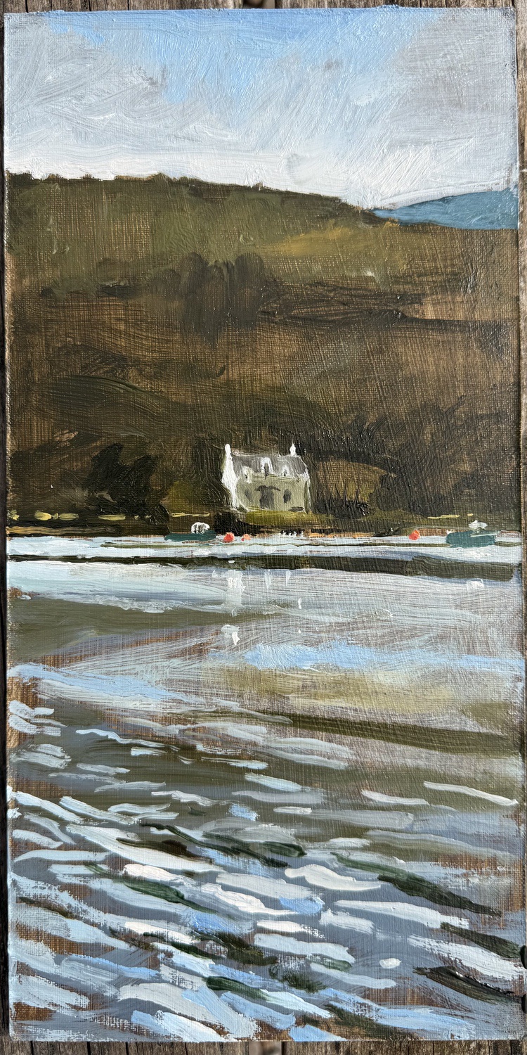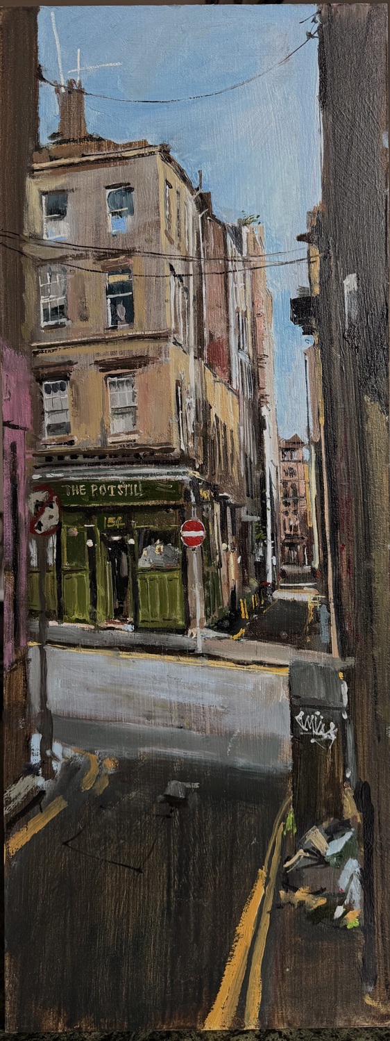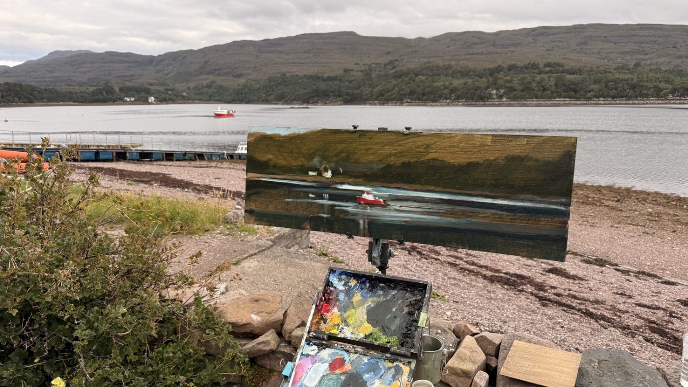This means lugging mutiple canvases and boards, large and small, easel, palette and paints down winding rocky paths to the beach, through fences and nettles into woodland or through the bustling streets of Soho dodging traffic and busy urban life and navigating public transport with large wet canvases in London Glasgow and Rome.