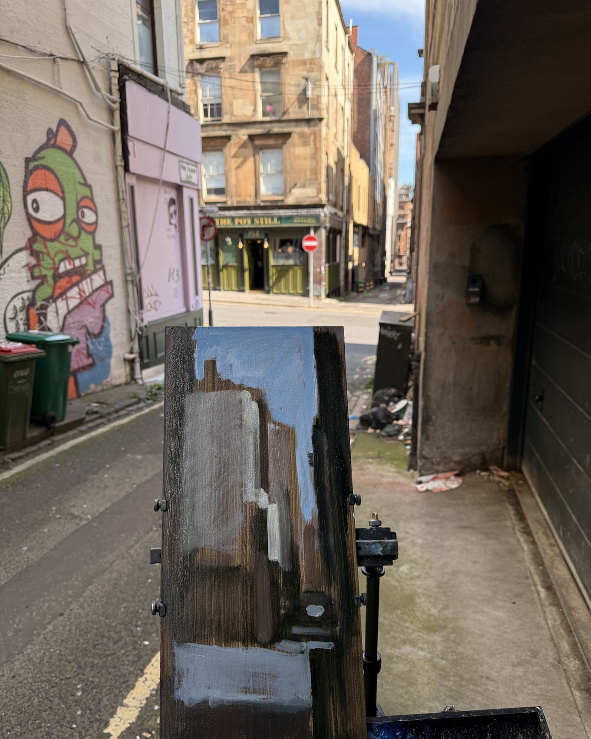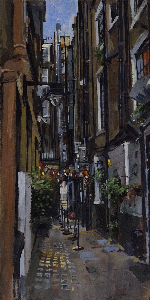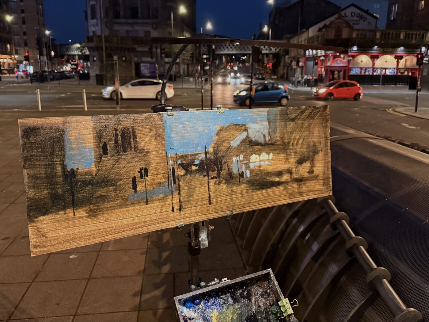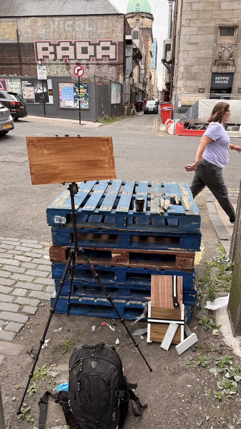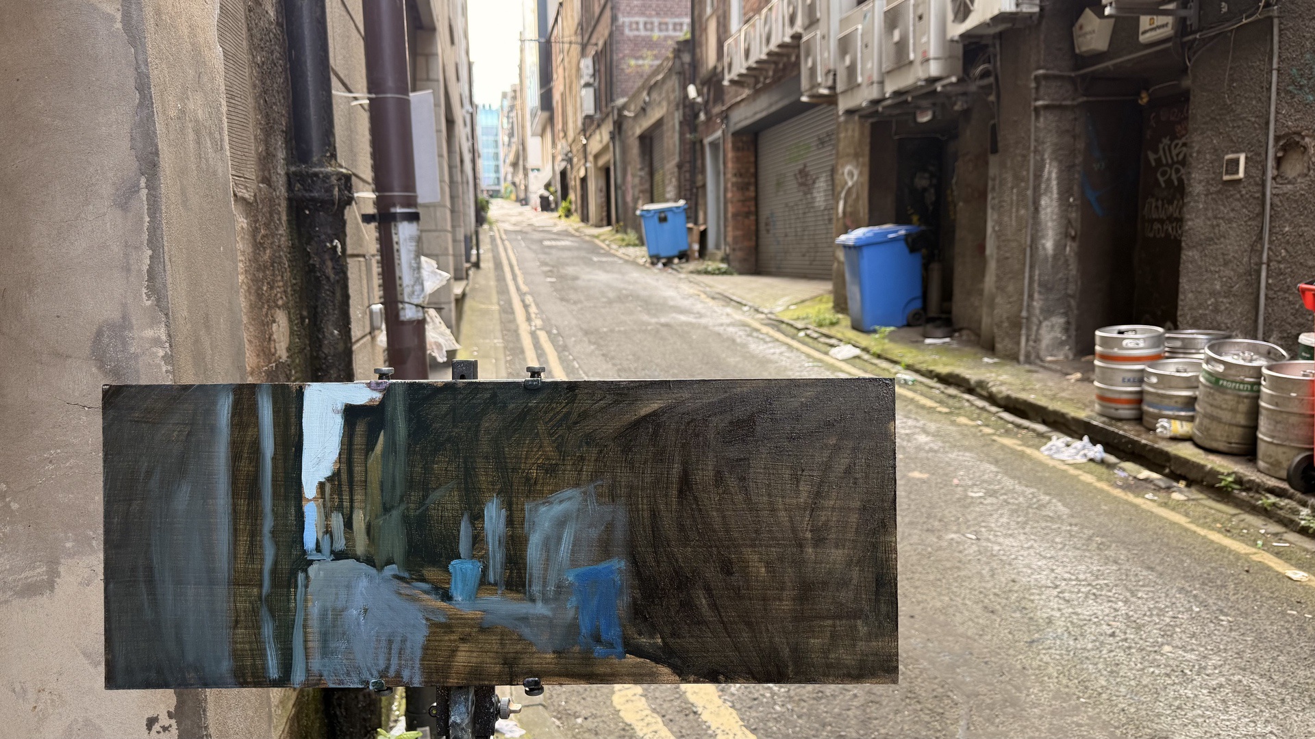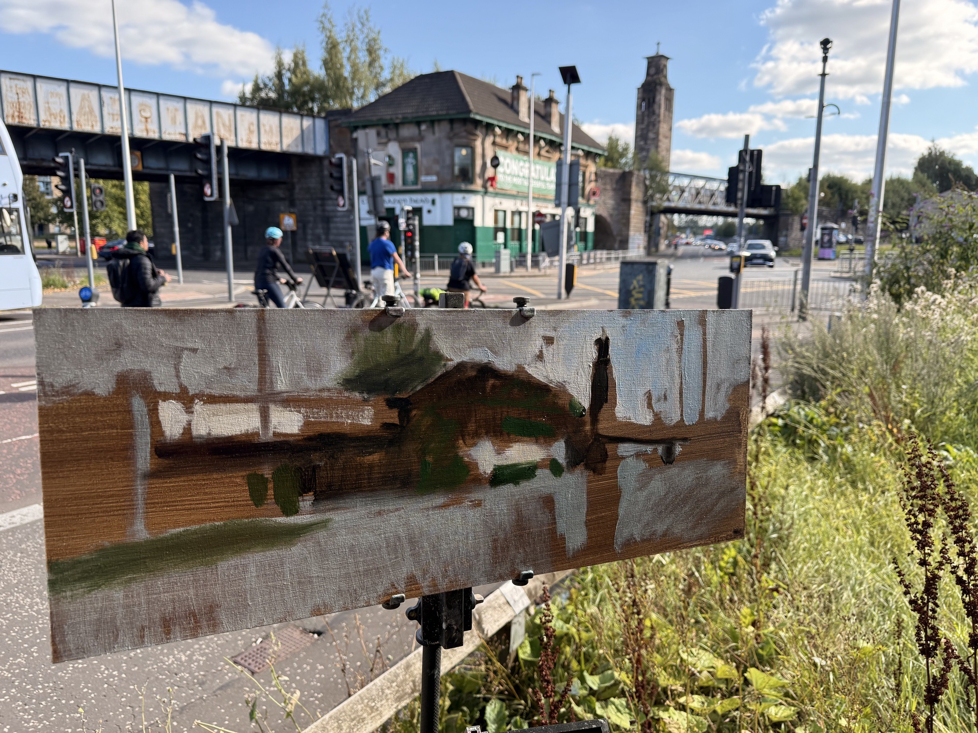This means lugging mutiple canvases and boards, large and small, easel, palette and paints down winding rocky paths to the beach, through fences and nettles into woodland or through the bustling streets of Soho dodging traffic and busy urban life and navigating public transport with large wet canvases in London Glasgow and Rome.
