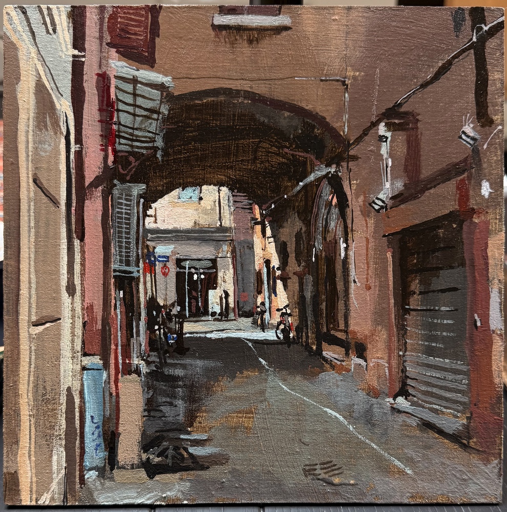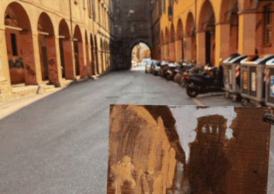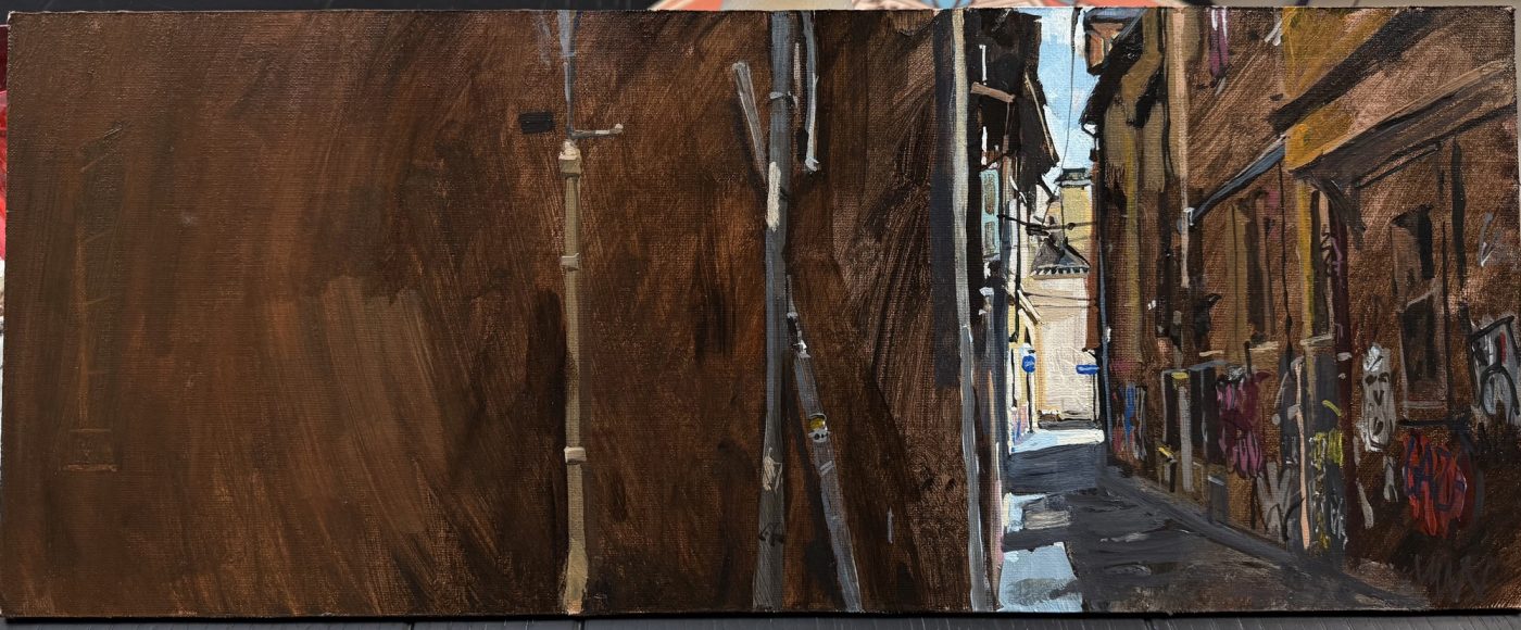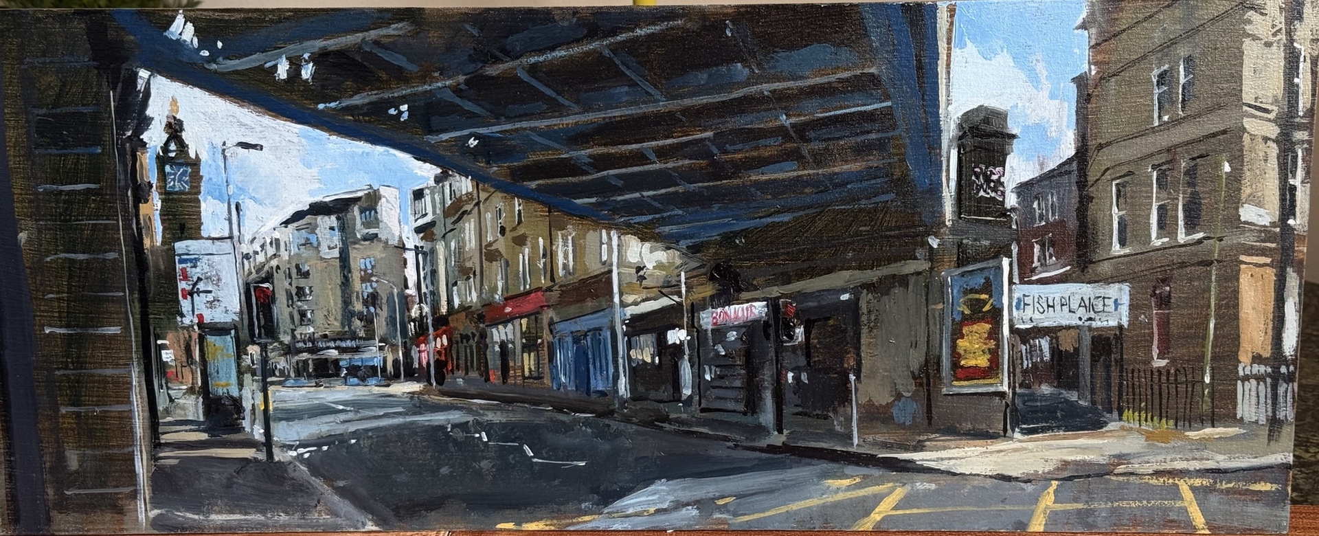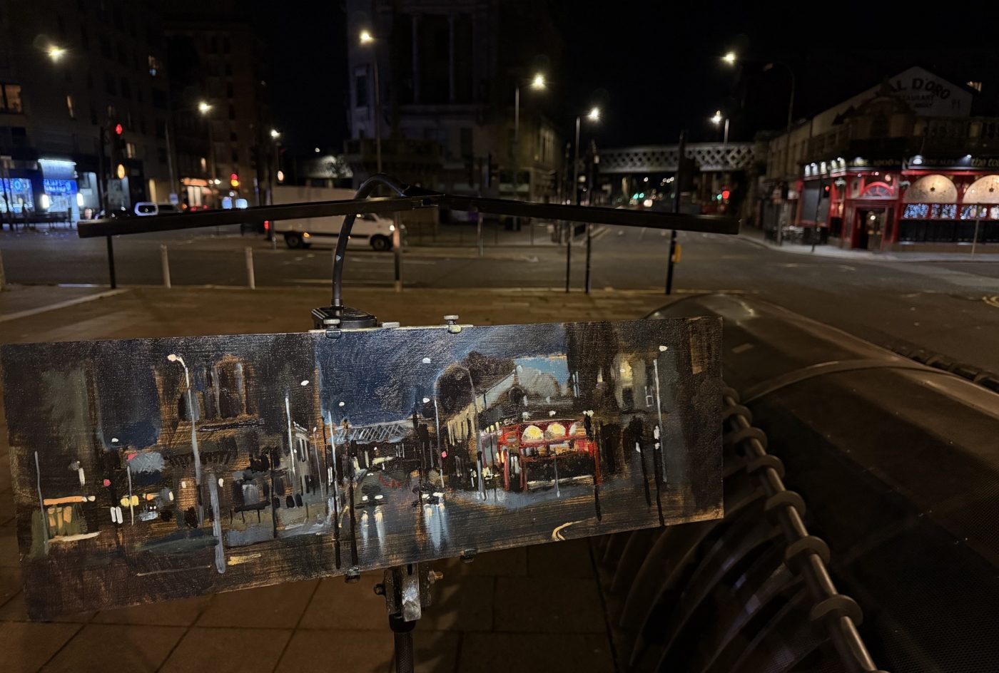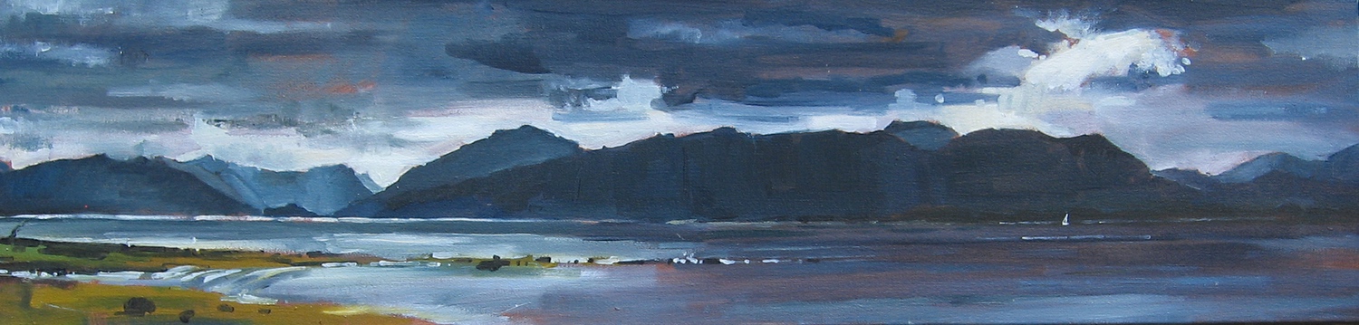 This means lugging mutiple canvases and boards, large and small, easel, palette and paints down winding rocky paths to the beach, through fences and nettles into woodland or through the bustling streets of Soho dodging traffic and busy urban life and navigating public transport with large wet canvases in London Glasgow and Rome.